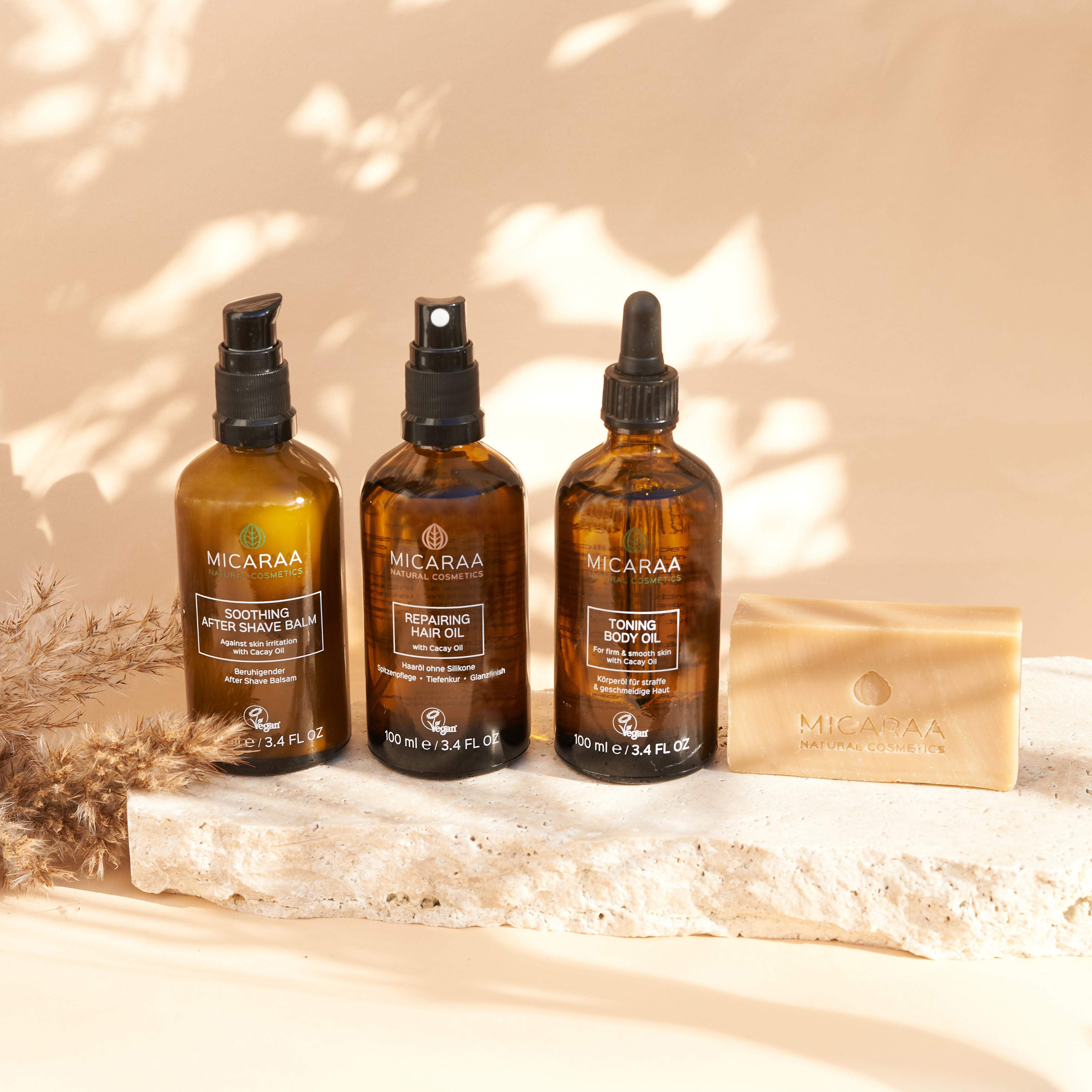 Die volle Kraft der Naturkosmetik von MICARAA in einem Körperpflegeset - Haaröl, Körperöl, feste Rasierseife und After Shave Balsam für die natürliche und vegane Pflege.