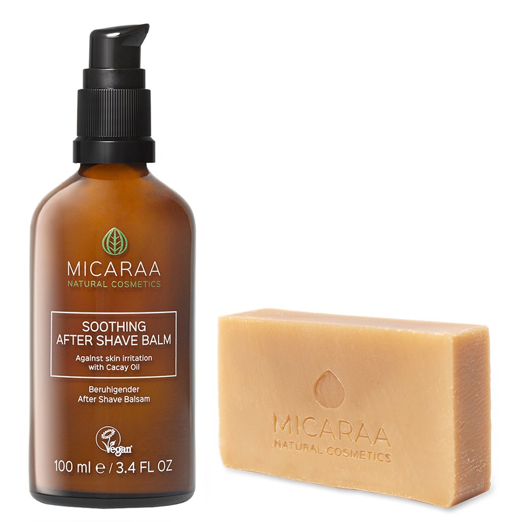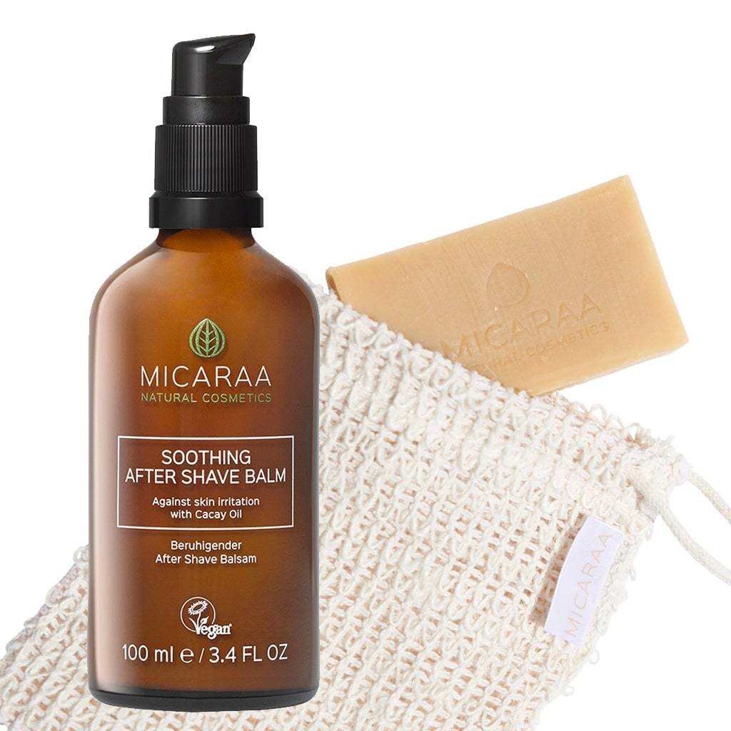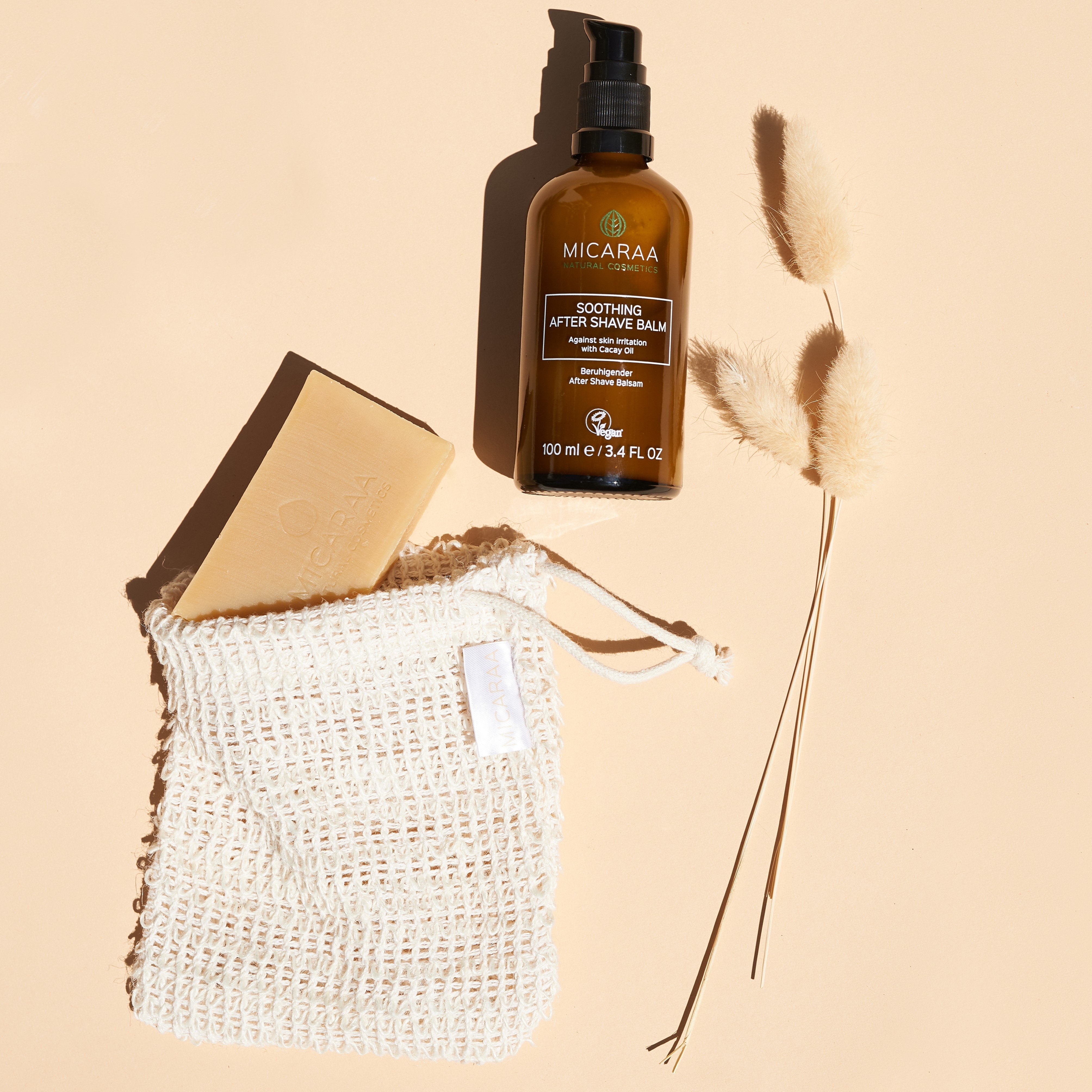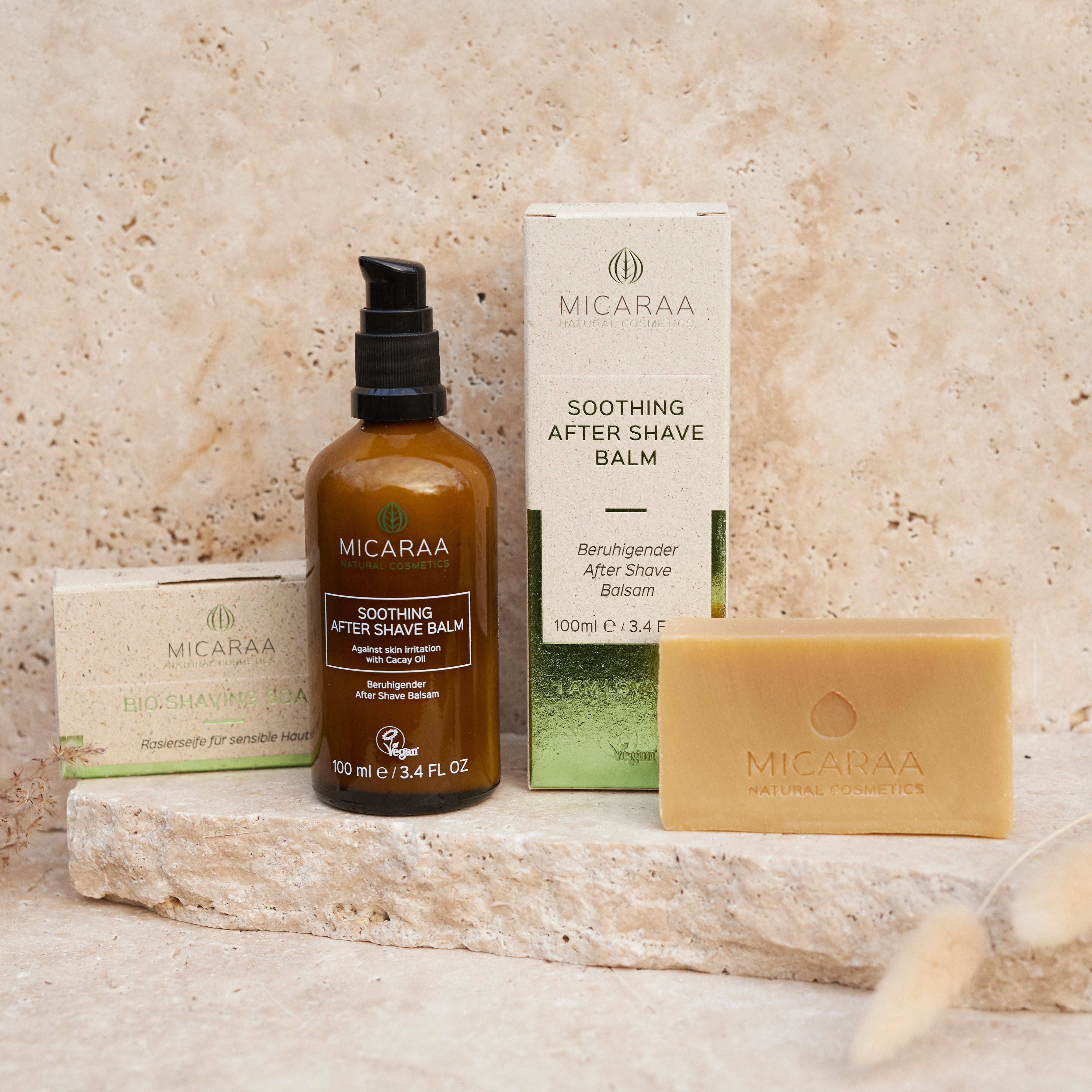 Die Bio Rasierseife pflegt die Haut bereits während der Rasur und verringert so Verletzungen. Das Soothing After Shave Balm öffnet deine Poren und verringert so eingewachsene Haare.